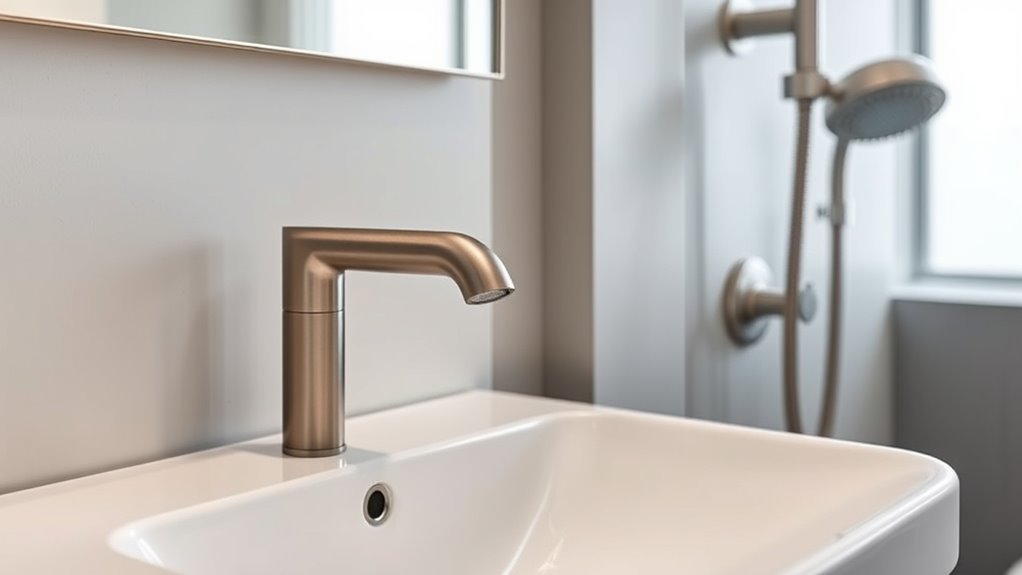 If you want water-saving fixtures that don’t feel cheap, opt for high-quality designs with sleek finishes like matte or brushed metals. Look for models made from recycled yet durable materials or modern plastics that mimic upscale looks. Features like adjustable flow regulators and aerators improve performance, while stylish shapes and minimalist designs elevate your decor. Choosing well-crafted fixtures guarantees sustainability without sacrificing elegance—continue exploring options to find the perfect balance of style and efficiency.