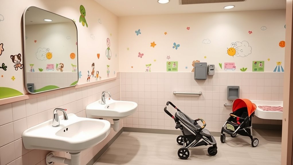 Not all restrooms have accessible features for children with disabilities, but many now include ramps, wider stalls, and grab bars to enhance accessibility. You’ll find that these facilities often offer stroller security options, like designated stroller parking or secure storage. Always check the signage or ask staff if you’re unsure, so you can guarantee a safe and comfortable experience for your child with special needs.