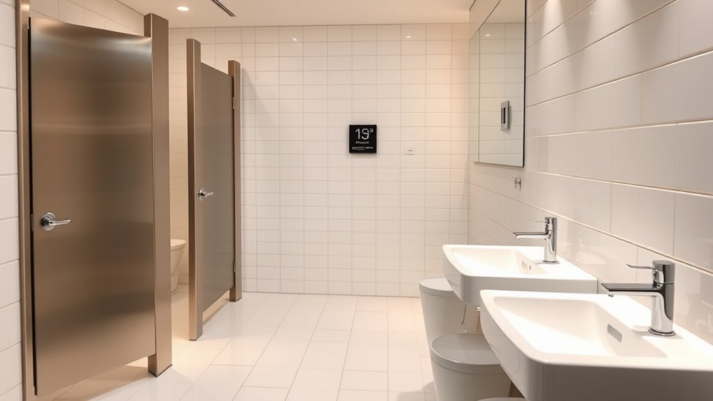 Tracking restroom use is like having a reliable compass, so you’ll want to choose sensors with high accuracy. Infrared or occupancy sensors are popular, but make certain they have proven sensor accuracy to avoid false readings. Prioritize technology that respects data privacy—use anonymized or encrypted data to protect user identities. This way, you get precise insights without compromising privacy, helping you optimize restroom placement effectively.