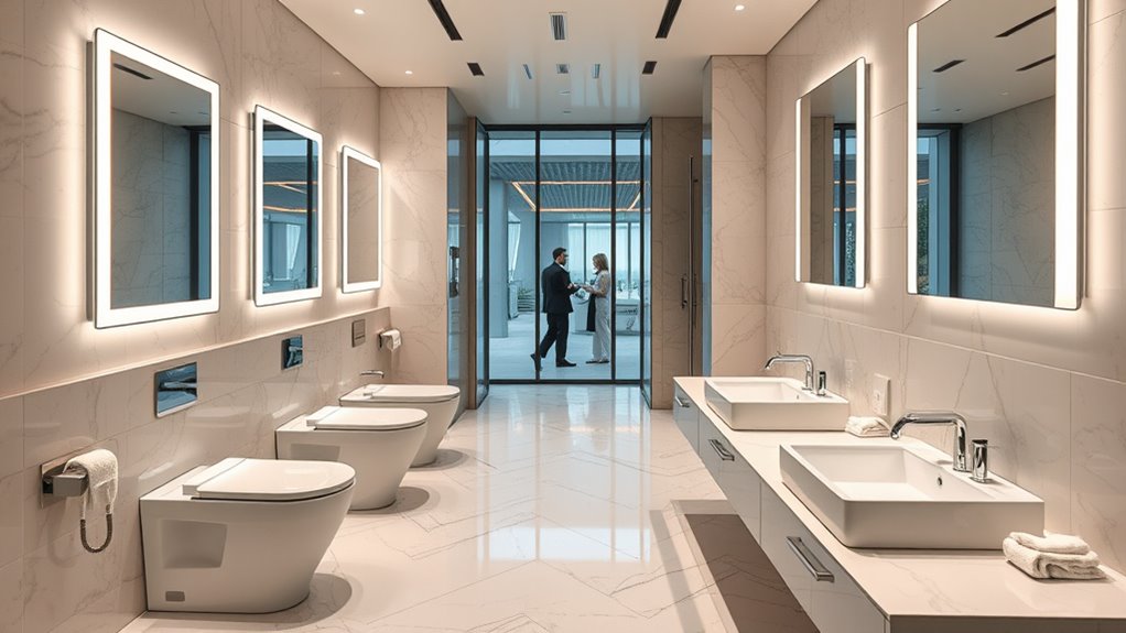 Luxury restrooms at corporate offsites can make a surprising difference by boosting comfort and reducing distractions. When guests feel pampered with high-end amenities, they’re more relaxed and open, encouraging better conversations and stronger bonds. These upscale facilities show your company truly values employee well-being, creating a positive atmosphere that lasts beyond the event. Want to discover more ways luxury amenities elevate your corporate retreats? Keep exploring to reveal the full potential.