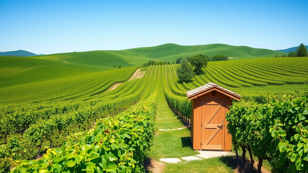 To seamlessly blend restrooms into your vineyard or farm venue, hide them behind natural screens like hedges, trees, or scenic features such as vineyards and crop fields. Use rustic materials like wood and stone to match the landscape and place units near key activity areas for convenience. Incorporate discreet lighting and decorative barriers like planters or trellises to conceal facilities without disrupting the rustic charm. Keep exploring how thoughtful placement can enhance your guests’ experience.