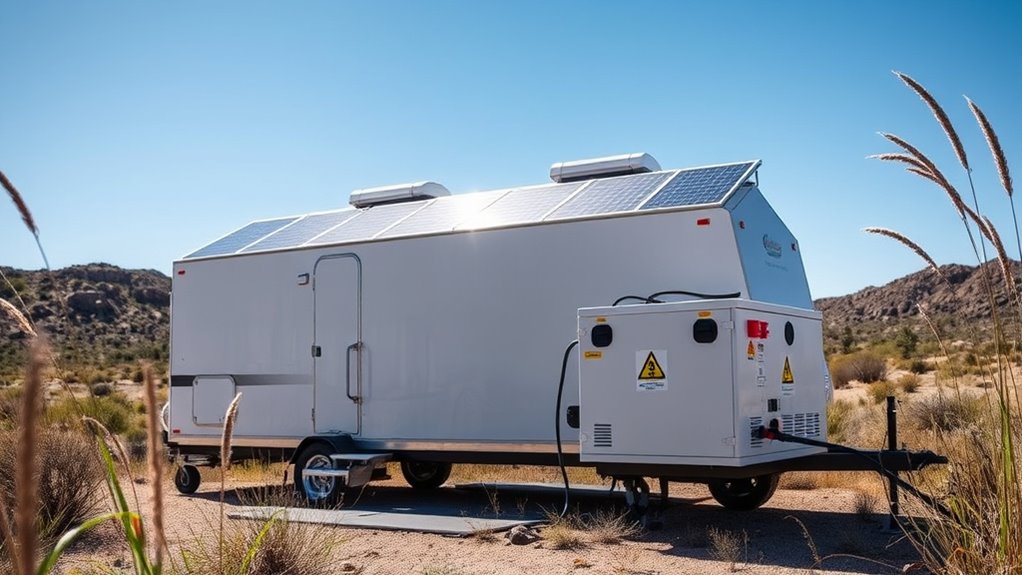 Implementing an effective energy management system helps monitor and control your solar and battery setup. Such systems can automatically switch between solar power and stored energy, optimize charging cycles, and alert you to any issues that need attention. This automation reduces manual oversight and guarantees your restroom trailer remains operational regardless of weather conditions. Regularly checking your battery storage solutions for signs of wear or potential failure helps prevent unexpected outages. Maintaining the health of your batteries, alongside routine solar panel cleaning and inspections, guarantees your power system remains dependable over time. Additionally, understanding battery technologies can help you select the most suitable and cost-effective storage options for your setup.