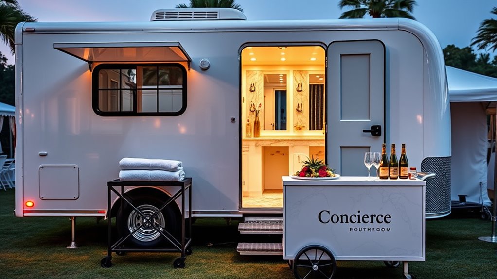 You can enhance your luxury restroom rentals by offering concierge services that provide luxury amenities like premium toiletries, fresh flowers, and personalized music playlists. These services create personalized experiences, making your clients feel truly pampered. Consider adding on-demand attendants, custom branding, or even gourmet refreshments. These extra touches elevate the overall event, leaving a lasting impression and increasing your value proposition for clients seeking high-end, tailored solutions.