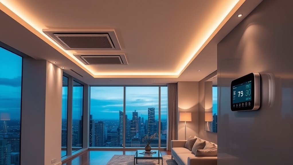 Smart thermostats and zoning systems let you personalize comfort while reducing energy use in your luxury unit. They learn your schedule, adapt to your preferences, and allow remote control for maximum convenience. By dividing your space into zones, you can optimize temperature in each area, preventing wasted energy. Implementing these technologies not only boosts comfort but also lowers utility bills and supports sustainability. Keep exploring to discover how you can create an efficient, luxurious climate at home.