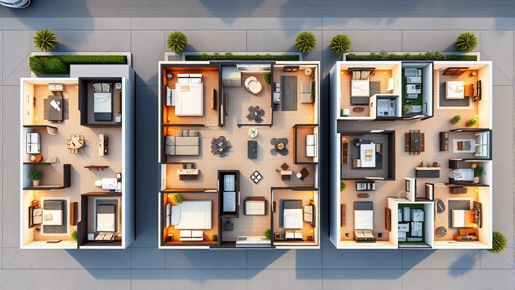 Floorplans show how different units are organized to fit your lifestyle, from compact 2-station layouts to spacious 5-station luxury homes. With 2-station designs, you’ll find efficient spaces that maximize utility in small footprints. The 3-station layouts offer more separation, providing privacy with dedicated zones for sleeping, living, and cooking. Luxury 5-station units give you multiple bedrooms and special spaces for comfort and entertainment. Keep exploring to see how these designs meet your lifestyle needs.