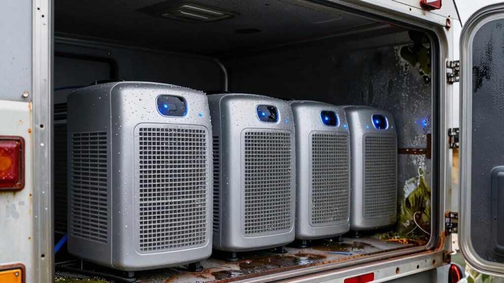 Imagine your trailer as a boat on a calm lake—adding a dehumidifier is like installing a steady hand on the rudder, steering clear of hidden storms. Just like too much moisture can suddenly sink your boat with mold, keeping humidity below 60% can keep your space mold-free. Don’t wait until dampness takes over; act now. A small dehumidifier can be your life raft, protecting your trailer—and your peace of mind.