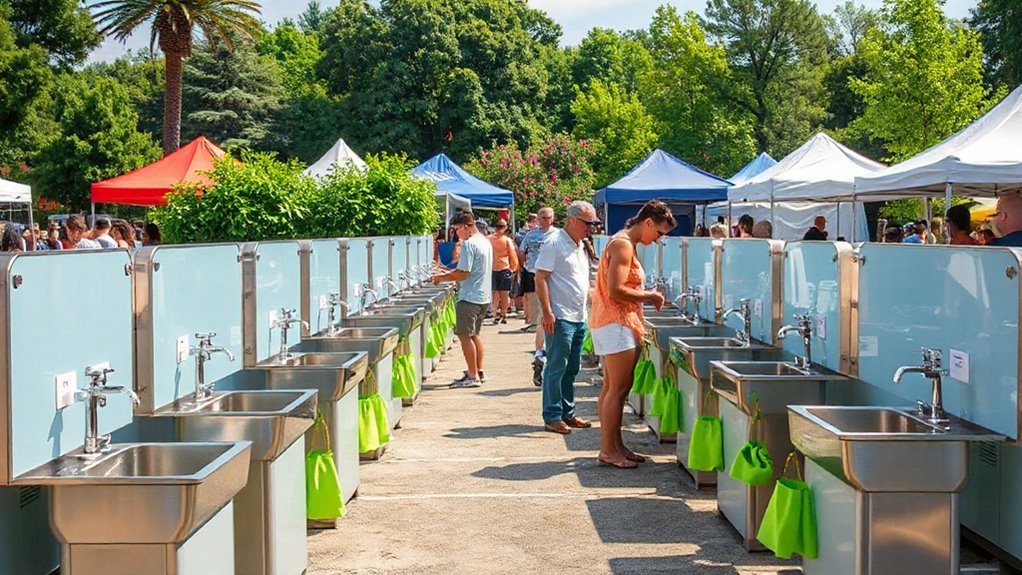 Imagine setting up a large outdoor festival where hygiene is key. Choosing the right 4-station portable handwashing station guarantees everyone can wash up easily, keeping your event safe and enjoyable. For instance, a food truck festival I managed thrived by selecting a sturdy, multi-compartment sink, preventing long lines and contamination. Whatever your event, prioritizing durability, ease of use, and portability will make a real difference. Trust me, the right station makes all the difference!