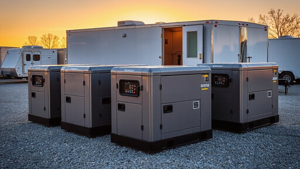If you’re looking for the best 50 amp generators for restroom trailer hookups in 2026, I recommend considering reliable options like VEVOR, H HZXVOGEN, RVMATE, PAULINN, and WELLUCK. These models feature heavy-duty wiring, weather-resistant constructions, and include essential safety certifications like UL and ETL. They support high power capacities and are easy to install and connect with waterproof cords and inlet boxes. Stick around, and I’ll walk you through all the vital factors to pick the perfect generator for your needs.