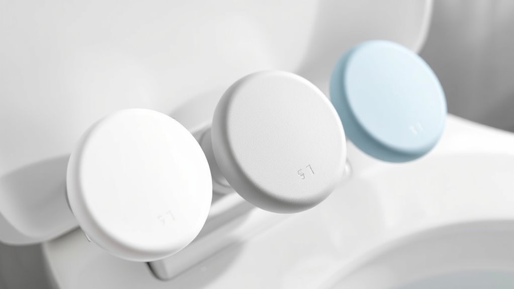 Choosing an antimicrobial toilet handle cover that fits well with your seat requires careful consideration of compatibility factors. First, confirm the cover works with both flat and curved seats, since designs vary. Check its dimensions to verify it will stay secure without slipping or causing instability. It’s also important to verify if the cover can be installed on different seat materials like porcelain, plastic, or ceramic. If your seat has hinges or contours, make sure the cover supports installation on those features. Lastly, review the attachment method—whether adhesive or screw-in—and make sure it’s suitable for your specific seat shape and material. Compatibility ensures the handle cover stays in place, providing effective hygiene without causing damage or discomfort.