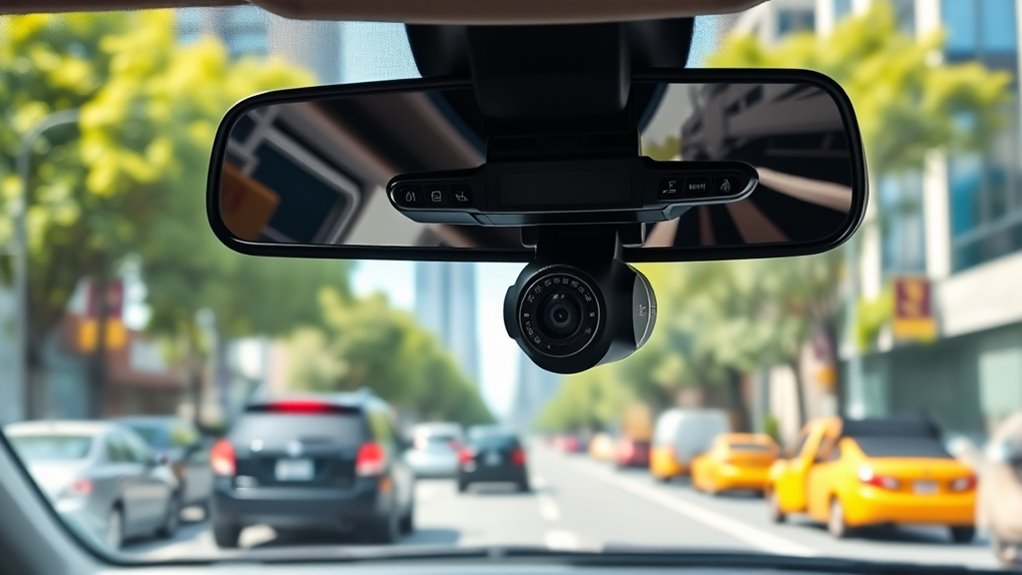 Parking mode features play an essential role in safeguarding your vehicle when you’re away. They include options like time-lapse recording, motion detection, and impact (G-sensor) activation, which monitor your car during parking. Continuous monitoring usually requires a hardwire kit or external power source to run 24/7, especially for impact detection and recording. Some dash cams automatically lock footage during collisions or vandalism, preventing overwriting and preserving vital evidence. The effectiveness of parking mode depends heavily on the dash cam’s power management; supercapacitors often outperform batteries in extreme temperatures, offering greater durability. To guarantee full functionality, I recommend verifying compatibility with your vehicle’s electrical system and checking if additional accessories, like hardwire kits, are necessary for seamless operation and reliable protection when parked.