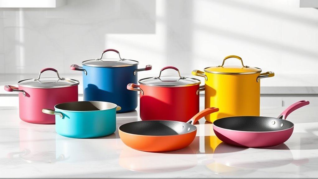 When choosing a Caraway cookware set, considering its versatility is essential for making the most of your investment. These sets include a variety of shapes and sizes, like fry pans, saucepans, Dutch ovens, and specialty pots, perfect for different cooking techniques. The non-stick ceramic surfaces ensure easy food release and quick cleanup, whether you’re sautéing, simmering, or baking. Compatibility with stovetops, including induction, gas, and electric, allows for seamless use in any kitchen setup. Oven safety up to 550ºF adds flexibility for switching from stovetop to oven cooking, like roasting or baking. Plus, specialized lids and accessories expand your options, making these sets suitable for a wide range of meal preparations and cooking styles.
