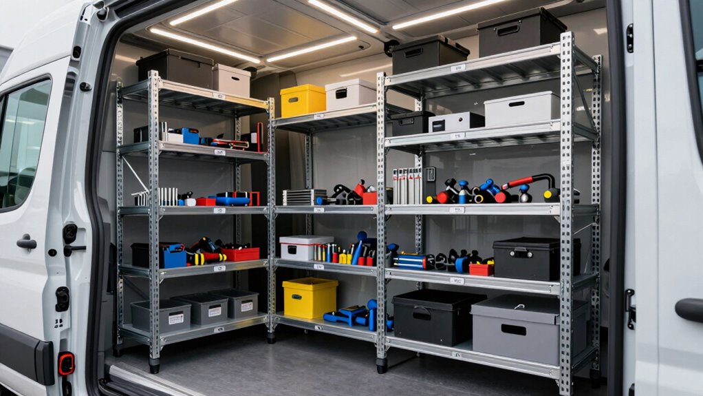 Customization and flexibility play a crucial role in selecting a cargo van shelving system that fits your unique operational needs. I look for adjustable shelves and dividers that let me tailor storage to specific tool sizes and workflows. Flexible mounting options, like pre-drilled holes and adjustable brackets, make it easy to position and reconfigure shelves as my inventory or equipment changes. Modular systems are a game-changer, allowing me to expand or reduce storage by adding or removing units. Accessories such as hooks, bins, and partitions boost organization and help me adapt to different tasks. A versatile shelving system supports various load capacities and configurations, maximizing space while ensuring safety. This flexibility ensures my van setup evolves with my business, keeping operations efficient and organized.