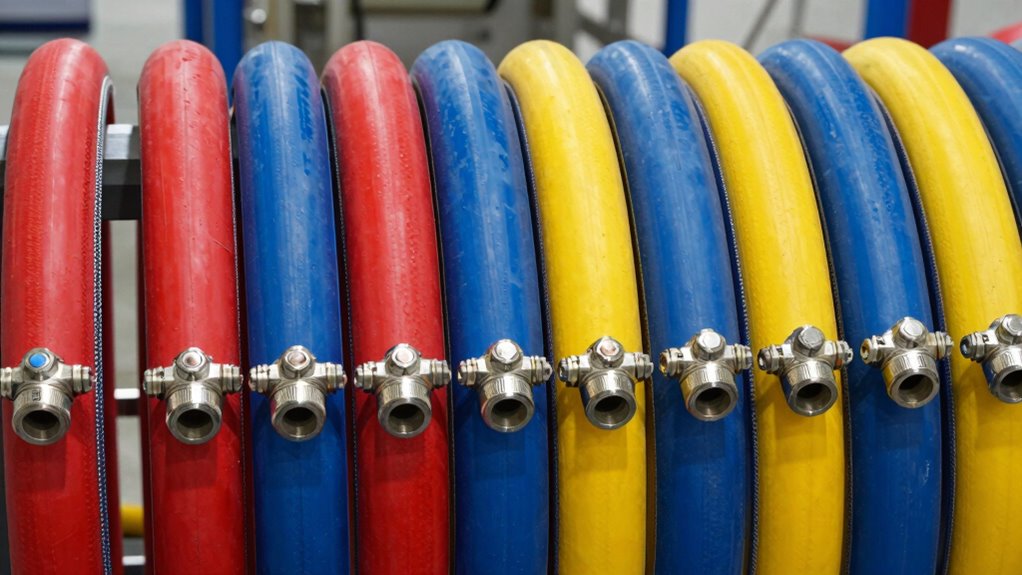 Reinforcement materials play a crucial role in determining a chemical-resistant waste transfer hose’s strength and durability. Braided polyester, steel wire, and synthetic yarns all serve to increase pressure resistance and prevent bursting under heavy loads. Steel wire reinforcement offers high tensile strength, making hoses suitable for high-pressure and high-temperature chemical transfers. Textile reinforcements like braided polyester or nylon provide flexibility, allowing hoses to bend without damage while maintaining durability. The choice of reinforcement directly impacts the hose’s burst pressure rating; steel-reinforced hoses typically withstand higher pressures than textile-reinforced ones. Proper reinforcement also helps prevent kinking, crushing, and wear, considerably extending the hose’s service life in demanding environments. Selecting the right reinforcement material ensures safety, efficiency, and longevity.