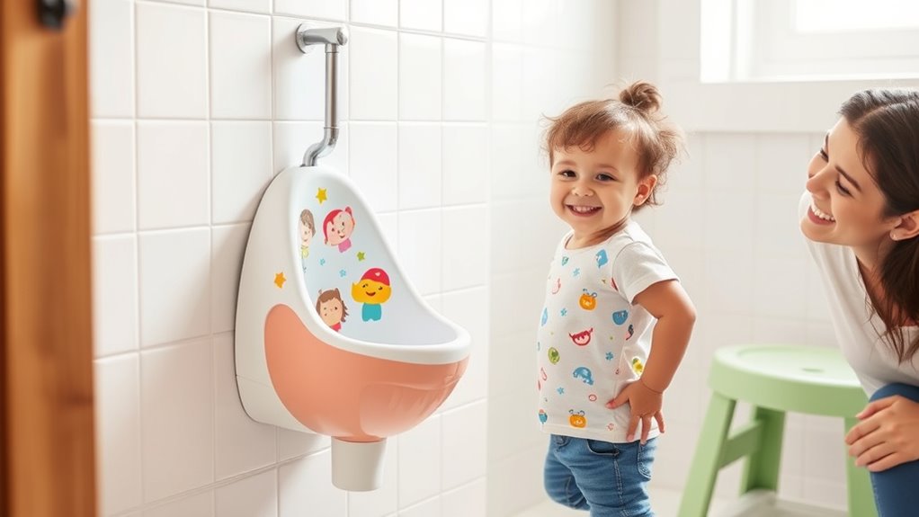 Choosing the right potty training urinal for your child starts with guaranteeing it fits their age and size. Most urinals are designed for children aged 1-6 years, so selecting one appropriate for their current development stage helps promote comfort and confidence. Check that the height and size are suitable—too tall or small can make the experience frustrating. Adjustable height features are a smart choice since they grow with your child, extending usability. Additionally, consider whether the design and features are engaging for your child’s age, like fun shapes or aiming targets, to make bathroom time more appealing. Most importantly, guarantee the urinal is made from safe, non-toxic materials to keep your little one secure during use.