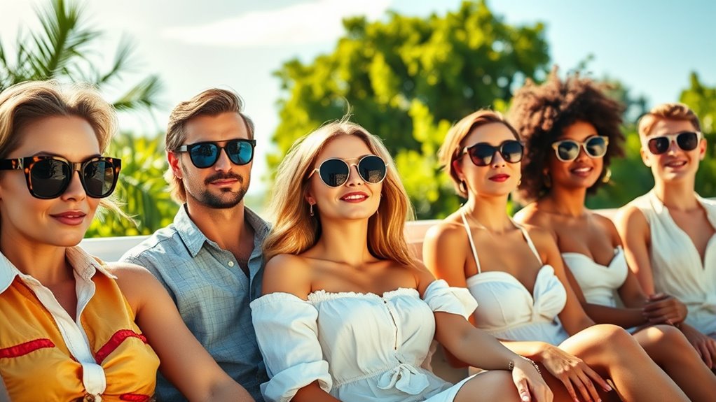 Choosing designer sunglasses that are versatile enough to suit various occasions is essential for making the most of your summer wardrobe. I look for frames like square or oval shapes, as they work well with both casual beach days and more formal outings. Neutral colors such as black, tortoise, or gold easily match different outfits and accessories, saving me time when getting ready. Comfort is key, so I choose models with adjustable or secure fits that stay in place during active outdoor activities. High UV protection and polarized lenses are a must to guarantee my eyes stay safe and clear regardless of the setting. Finally, I prefer styles that shift seamlessly from daytime beach trips to evening events, maximizing their usability and value.