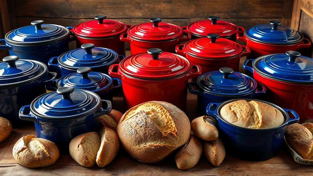 When it comes to perfecting sourdough, choosing the right Dutch oven is a game changer. I recommend models that range from 4.5 to 7 quarts, like the MÜELLERHOME and Lodge options. Their enameled cast iron construction guarantees even heat distribution and moisture retention, which are essential for that crusty, flavorful loaf. Plus, vibrant colors add a nice touch to your kitchen. Stick around to discover the best options that can elevate your baking experience even further.
