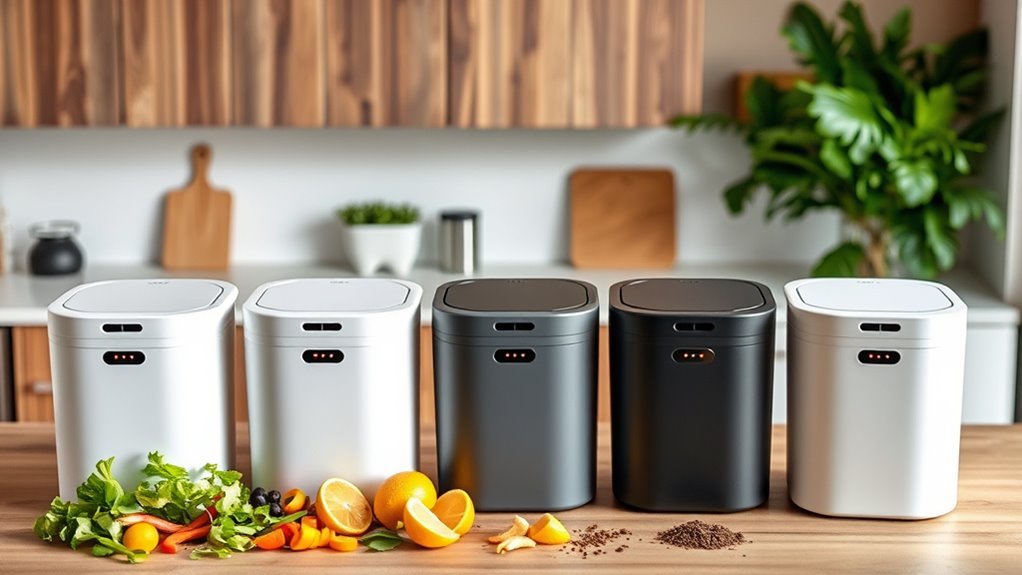 If you’re looking for the best electric compost bins for your kitchen, you’ll find options ranging from compact 3L models to larger 4.2L units with advanced odor control and auto-cleaning features. I recommend considering capacity, noise level, and ease of maintenance to find the right fit. Some models process waste quickly and operate quietly, making your life easier. Keep exploring—I’ll share top picks and tips to help you choose the perfect eco-friendly solution.