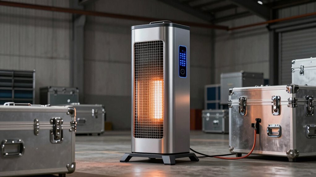Noise levels vary among 15,000W electric heater models, and I’ve found that many modern units operate quite quietly, often comparable to a fan or background noise. Some models feature noise reduction technology, making them suitable for workplaces or environments where silence is important. When choosing, I recommend checking product specifications for decibel ratings to guarantee you select a heater that won’t disrupt your space.