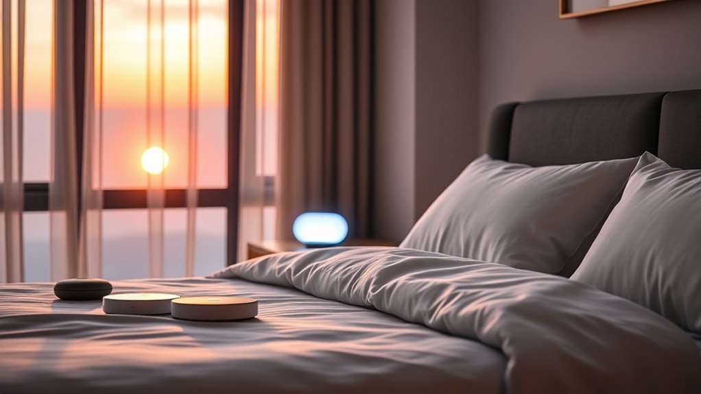 Selecting a device with versatile sound and light options can substantially improve your sleep experience. I look for models that offer a variety of sounds, like white noise, pink noise, brown noise, and nature-inspired sounds, to match my mood and preferences. Customizable brightness levels and color options are essential for creating a calming environment, while sunrise alarm features help wake me gradually. Additional soundscapes or sleep stories can boost relaxation, making it easier to drift off. I also prioritize devices that let me control sound and light settings easily—no complicated apps or Wi-Fi needed. A sleep-friendly design with dimmable lights and natural cues helps align my circadian rhythm, ensuring a restful night and refreshed morning.
