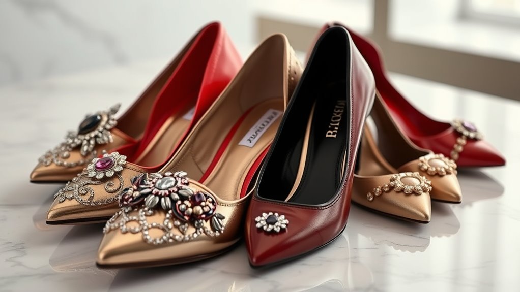 Choosing the right fit is essential because even slight sizing errors can lead to discomfort and reduce the longevity of your shoes. High-end women’s shoes often come in multiple width options, so selecting the correct width is key to ensuring comfort. Keep in mind that sizing can vary across brands and styles, so always measure your foot and consult the specific size charts before purchasing. Some luxury shoes tend to run small or narrow, which might mean sizing up or opting for wider widths for a better fit. Customer reviews are helpful—they often mention sizing discrepancies, so reading them and understanding the brand’s return policy is smart. Paying close attention to sizing details guarantees your shoes will be both beautiful and comfortable.
