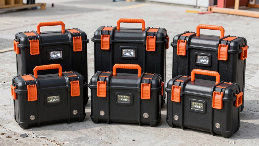 Think of lockable storage as a fortress for your tools—absolutely essential. Yes, many options come with sturdy, built-in locks or padlockable latches, giving you peace of mind that your equipment stays secure. Some cases even have digital locks for added security. It’s like having a personal guard for your power supplies, ensuring your valuable tools and batteries stay safe from theft or unauthorized access.