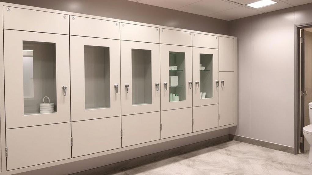 Think of lock mechanisms as the guardians of your restroom supplies—each one with its own style of armor. Some use traditional key locks, turning a simple twist into a secure seal. Others feature digital or keypad locks, like high-tech sentinels that require codes or biometric scans. Cam locks and latch bolts are common too, offering sturdy, reliable security. I find that choosing the right lock depends on your specific safety needs and convenience preferences.