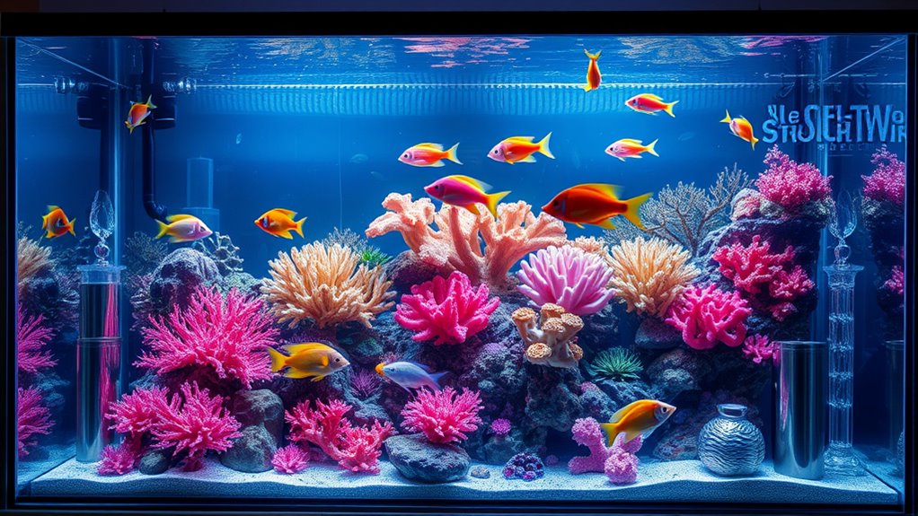 To guarantee your luxury aquarium accessories enhance rather than hinder your tank’s environment, it’s essential to take into account their size and how well they fit within the available space. Measure your tank’s interior length, width, and height to ensure the decorations don’t block filtration or light. Choosing appropriately scaled pieces is key; larger decorations offer more hiding spots for bigger fish, while smaller accessories suit nano tanks. Consider the overall layout to maintain a balanced aesthetic and functional environment, avoiding overcrowding. Opt for accessories with adjustable or modular features, allowing you to customize their fit and arrangement easily. Proper sizing ensures your tank remains healthy and visually appealing, transforming your aquatic space into a harmonious, luxurious haven.
