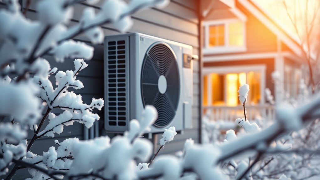 Selecting the right heating capacity is just the beginning; understanding the temperature operating range is equally important for mini-split heat pumps in cold climates. I always check that the unit specifies a low ambient operating temperature, ideally down to -13°F or lower, to guarantee it performs effectively. Look for systems with hyper heat technology or a cold climate mode that maintains heating efficiency even at sub-zero temperatures. It’s vital that the manufacturer’s temperature operating range matches the coldest temperatures typical in your area. I also recommend models with advanced defrosting features to prevent ice buildup during prolonged cold spells. Remember, standard heat pumps may struggle below 25°F, so opt for those rated for colder conditions for peak performance.