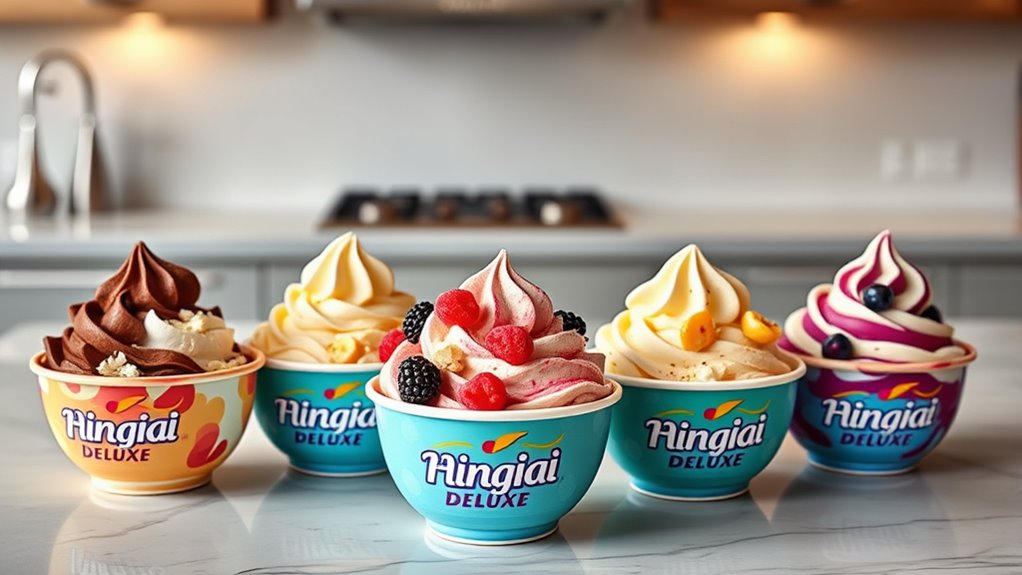 When selecting Ninja Creami Deluxe recipes, considering dietary customization options is essential to guarantee the frozen treats meet your health needs and taste preferences. You can swap ingredients for sugar-free, low-fat, or dairy-free alternatives, making recipes suitable for various diets. Adding protein powders or superfoods boosts nutritional value and helps meet specific health goals. Adjusting freezing times and churning techniques can modify the texture and consistency, ensuring the final product aligns with your preferences. Flavor infusions like vanilla bean or citrus zest offer personalized tastes without added sugars or artificial flavors. Additionally, using allergen-friendly ingredients and clear labels helps accommodate dietary restrictions and allergies, making sure everyone can enjoy delicious, tailored frozen treats safely and comfortably.