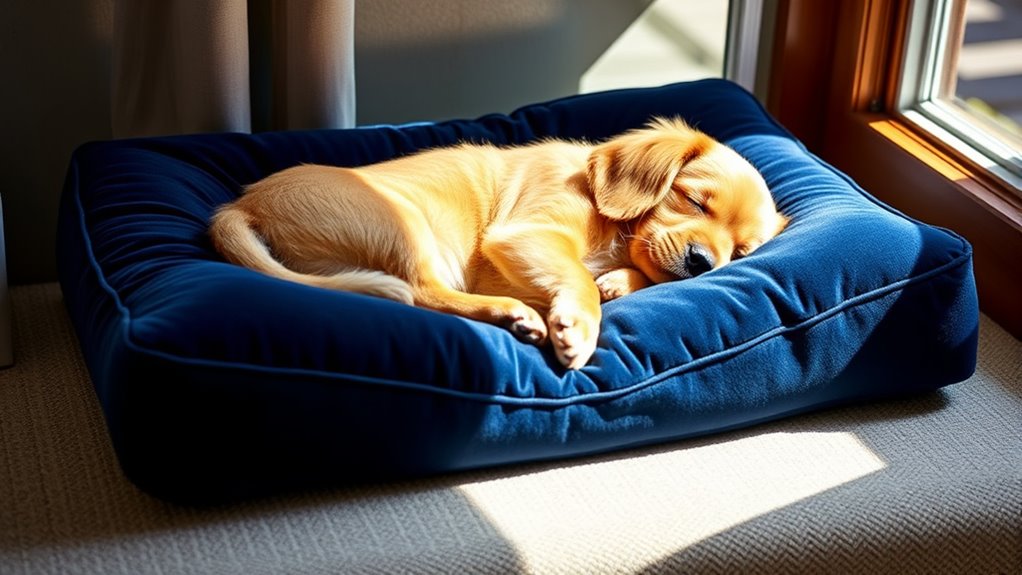 When shopping for an orthopedic dog pillow, prioritizing safety features can markedly reduce risks and ensure your pet’s well-being. Look for pillows with non-slip bottoms or stable bases to prevent slipping and potential injuries during use. Verify that waterproof linings or covers are included to protect against accidents and reduce health risks. Choose models with chew-resistant zippers and seams to prevent your pup from ingesting or damaging components. Opt for hypoallergenic, non-toxic materials in the fabric and foam to minimize allergic reactions and chemical exposure. Finally, confirm the pillow’s construction adheres to safety standards, ensuring it’s free from harmful chemicals and sharp edges. These features help create a safe environment, giving you peace of mind while your pup enjoys comfort and support.