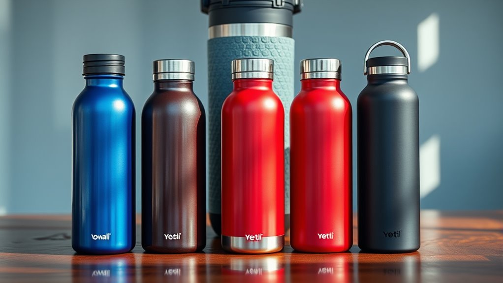 Durability and warranty are key factors to think about after considering the price differences between Owala and Yeti water bottles. I’ve found that durability largely depends on the materials used—stainless steel bottles tend to resist impacts and corrosion better, making them more long-lasting. Yeti bottles often feature double-wall insulation and high-quality construction, which boost their toughness. Warranties vary from limited lifetime to one year, offering peace of mind and protection against defects. A good warranty covers repairs or replacements, especially useful for active users. Proper care, like hand washing and avoiding hot liquids, can also extend the lifespan of these bottles. Ultimately, both brands offer durable options, but understanding their warranties helps ensure your investment lasts.