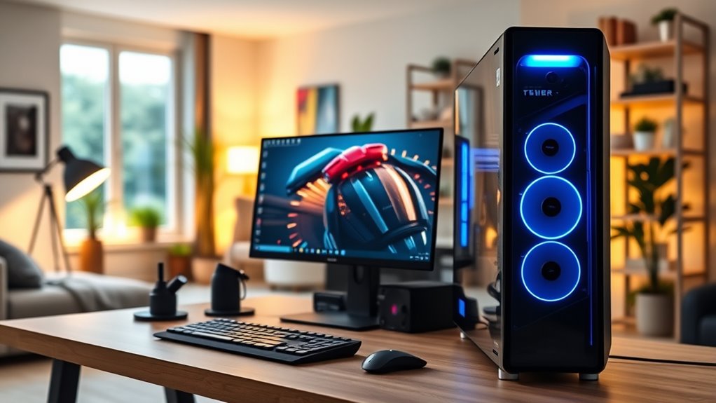 To guarantee your home office PC remains useful and future-proof, it’s vital to take into account its upgrade potential from the start. First, ensure the motherboard has available RAM and PCIe slots for future hardware additions. This makes upgrading components like memory and graphics cards straightforward. Next, check if the power supply offers enough wattage headroom to support new hardware, such as a more powerful GPU or additional storage devices. Compatibility is also key; confirm that your system can handle newer RAM types and capacities for seamless upgrades. A spacious case with good airflow is indispensable for accommodating larger components and maintaining optimal cooling. Lastly, verify that your operating system and firmware support hardware upgrades without requiring a complete overhaul, ensuring longevity and adaptability.