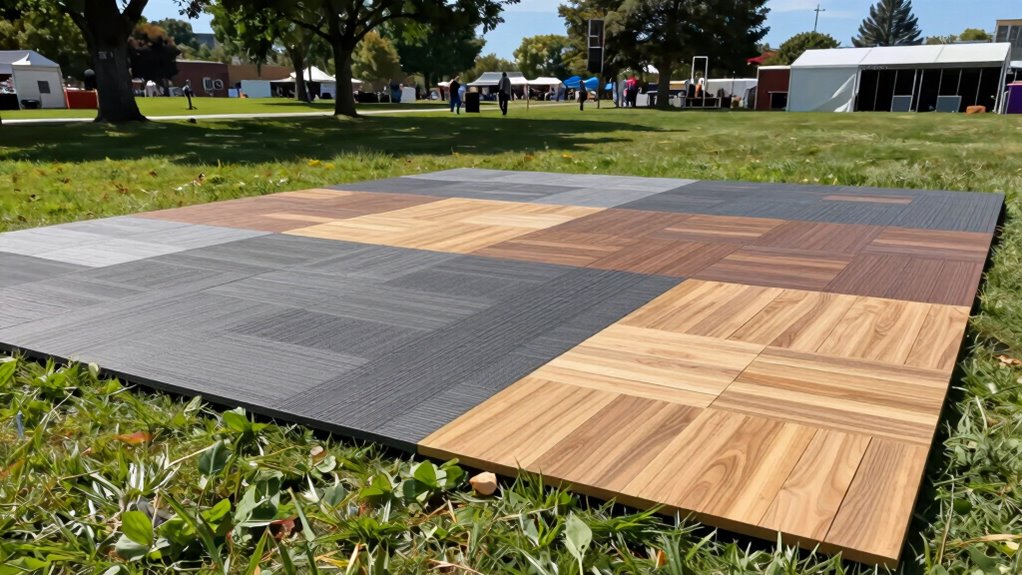 Selecting portable event flooring for grass becomes much easier when you prioritize solutions that are simple to install. I look for options with interlocking or snap-together systems that need minimal tools and no specialized skills, allowing quick assembly. Lightweight materials are essential, making transportation and handling manageable for a small team or even solo setup. Modular designs provide flexibility, letting me configure and expand the flooring easily without complicated modifications. Clear, straightforward installation instructions are a must to reduce setup time and avoid mistakes. Additionally, I consider flooring with drainage features or textured surfaces, which help ensure quick placement and secure fitting on uneven or soft grass. These factors combine to make installation efficient, saving time and effort for a smooth event setup.