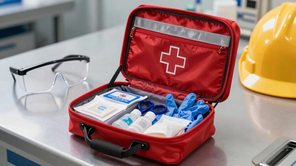 Choosing a large OSHA-compliant portable first aid kit requires careful consideration of its supply list to handle diverse injuries effectively. It should include a variety of bandages, gauze, antiseptics, burn treatments, and tools suitable for various emergencies. OSHA standards specify essential items like gloves, sterile dressings, and eye wash to guarantee safety and compliance. The kit must also have enough supplies to treat the maximum number of people it’s rated for, such as 50 or more individuals. Organized compartments and clear labeling are vital for quick access during emergencies. Including both essential and optional items, like tourniquets and cold packs, makes the kit more versatile, enabling it to address a wide array of first aid scenarios confidently and efficiently.