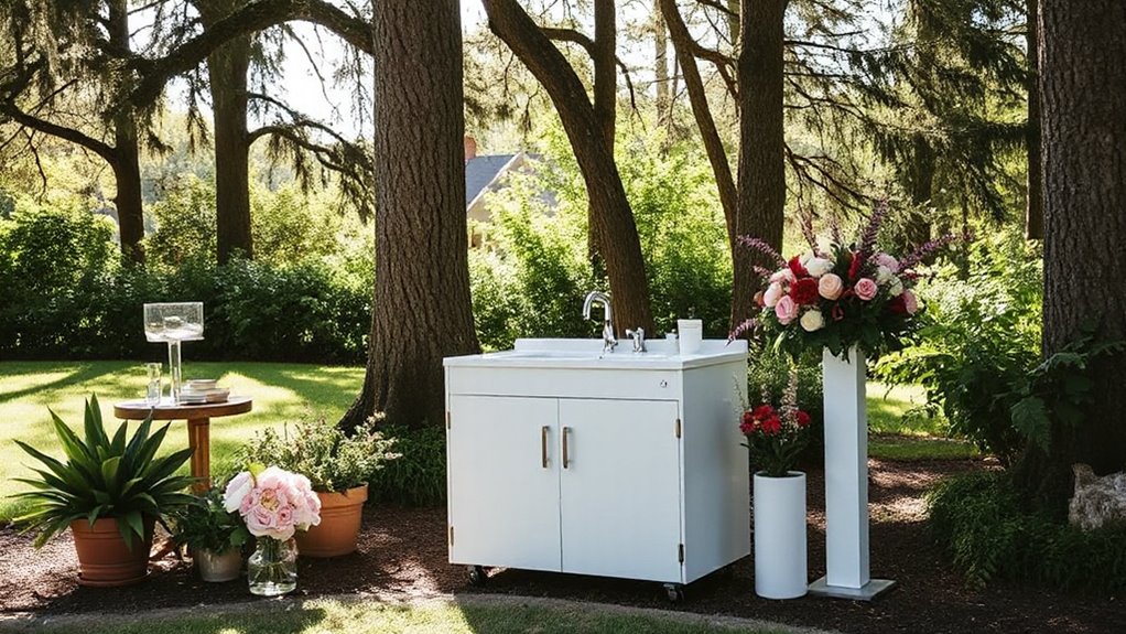 Choosing the right portable sink cabinet can make or break your outdoor wedding experience. Did you know that proper hand hygiene can reduce the spread of germs by up to 50%? Investing in a reliable system guarantees your guests stay safe and comfortable. With options like hot water features and mobility, you’re set for a seamless celebration. Trust me, a well-chosen sink system elevates the entire event and keeps everyone happy and healthy.