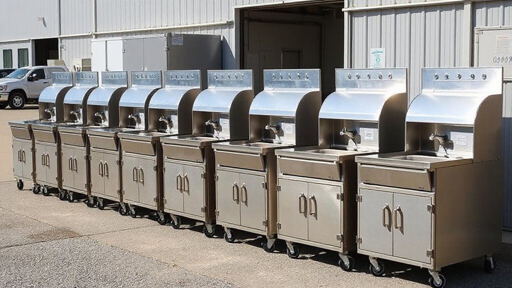 If you’re looking for the 15 best portable sinks with lockable cabinets and casters in 2026, I can help. These models are built for durability, easy mobility, and security, perfect for indoor or outdoor spaces like food trucks, festivals, or clinics. They feature sturdy materials, lockable cabinets, and smooth-rolling wheels to suit various needs. Keep going to discover detailed options and what to think about when choosing the right one for your setup.
