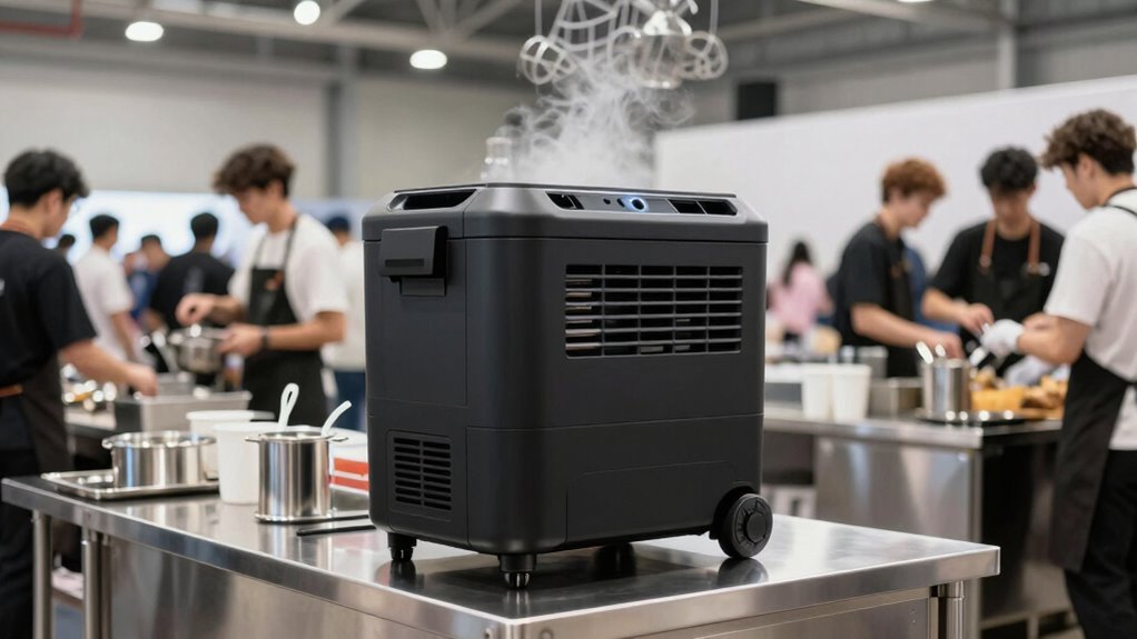 Installing a portable spot cooler for event back-of-house setups is typically simple, often requiring just plugging it into a standard power outlet. Many models don’t need permanent mounting or complex ductwork, so you can deploy and reposition them quickly. Features like plug-and-play operation, built-in handles, and lightweight designs make transportation and placement hassle-free. Some units might need connecting to a water source or drain for dehumidification, which can add a small step to the setup. Overall, clear, user-friendly controls and minimal assembly requirements ensure a smooth, straightforward installation process. This ease of setup allows you to focus more on your event and less on complicated equipment installation, making portable spot coolers a practical choice for quick, flexible cooling solutions.