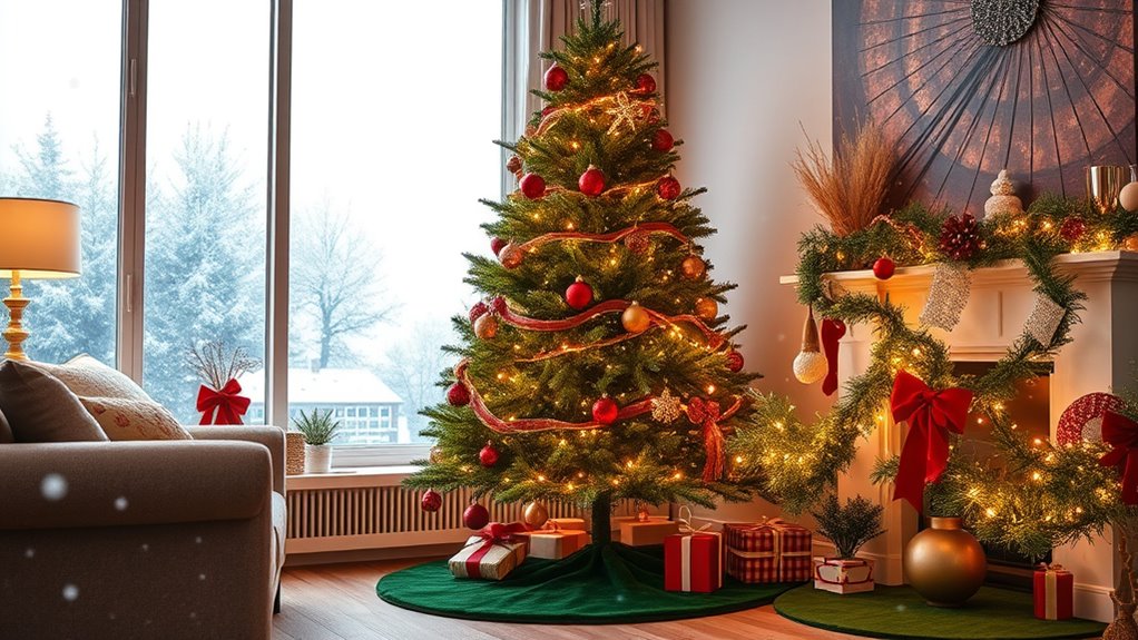 Choosing the right tree height and size can transform your holiday decor, making it essential to contemplate your space. Pre-lit Christmas trees typically range from 4 feet to over 12 feet, so think about your ceiling height. For instance, a 7.5-foot tree works perfectly in rooms with 8 to 9-foot ceilings. Larger trees offer more tips and lights, creating a fuller look, but they also need more setup and storage space. Don’t forget about the base diameter; it should match the height for balance and stability. If you have a smaller area, consider a compact, slimmer tree, although be aware they may lack the fullness of their larger counterparts.