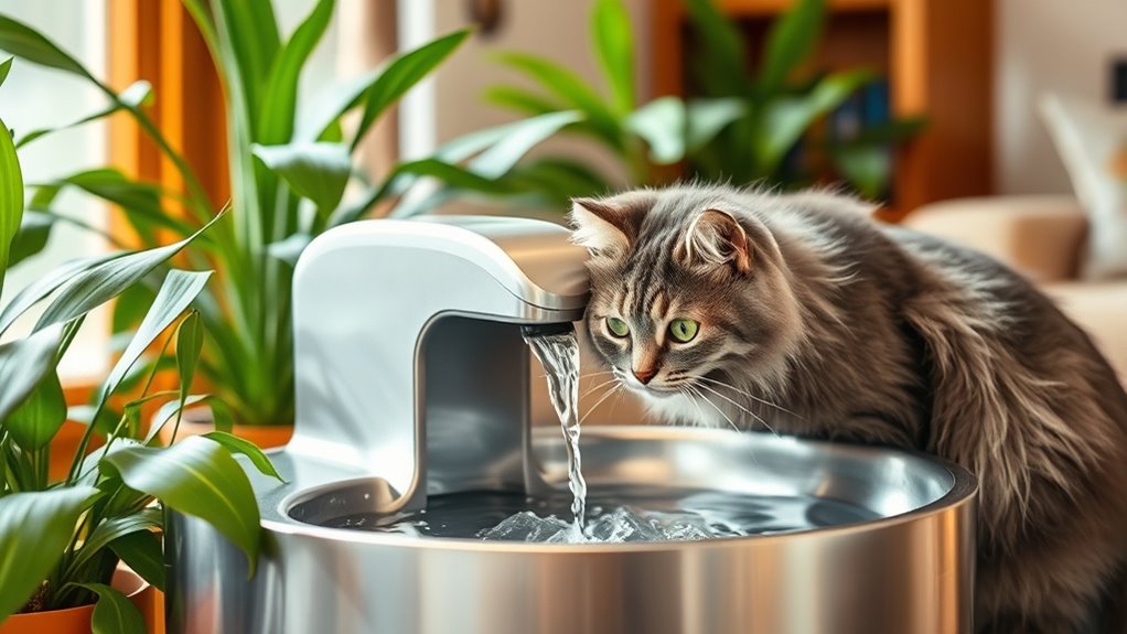 I’ve found that premium fountains generally operate quietly, which is a relief because I noticed my cat gets startled by loud noises. Most models are designed with noise reduction in mind, so they won’t disturb your pet’s nap or playtime. It’s a coincidence how many of these fountains are both stylish and silent, making them perfect for keeping your feline happy and relaxed without any annoying sounds.