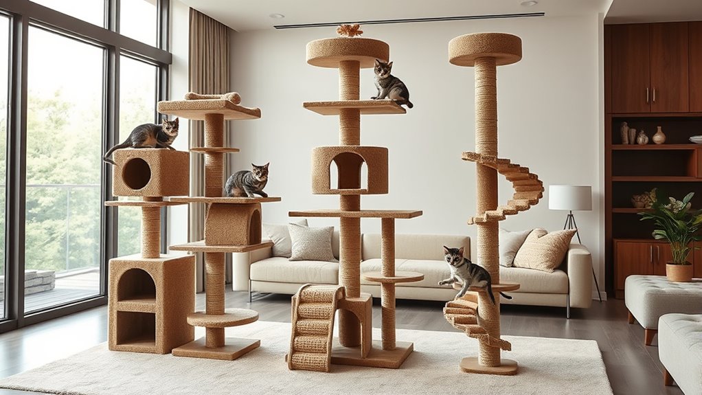 Choosing a premium cat tree or condo that matches your home’s decor and suits your cat’s needs requires careful consideration of design compatibility. I look for pieces that blend seamlessly with my space, so color and style matter. The design layout should include multiple levels, perches, and hideaways that match my cat’s activity preferences. I also check if the size and shape of resting platforms and condos are suitable for my cat’s breed and size, ensuring comfort. For cats with mobility issues, easy access is essential, so I consider the overall design’s accessibility. Finally, I verify that the structure offers enough scratching surfaces and interactive features that align with my cat’s play habits, encouraging activity and mental stimulation.