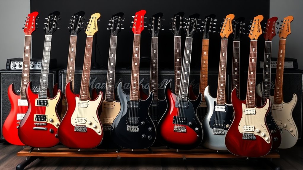 If you’re looking to elevate your sound in 2025, I recommend exploring premium electric guitars that boast superior craftsmanship, versatile tones, and durable build quality. Brands like Fender’s Squier Debut Series, Ashthorpe, Donner, and EVH strings offer models suited for various styles, from blues to rock. These guitars feature premium woods, reliable electronics, and versatile pickup configurations. Stay with me to discover more about the top choices that can truly boost your performance this year.