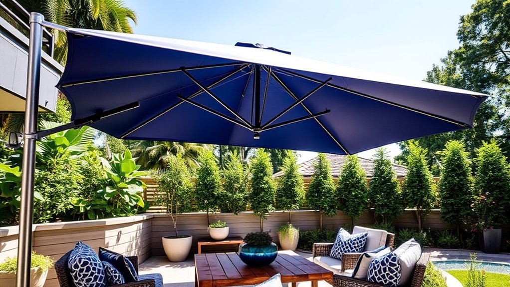 The size of a patio umbrella plays a key role in determining how much shade it provides, making it important to match it to your outdoor space. Larger umbrellas, like 11 or 15 feet models, offer extensive coverage ideal for big tables or gatherings. A 9-foot umbrella provides around 63 square feet of shade, suitable for small tables and chairs, while a 16-foot umbrella covers over 200 square feet, perfect for larger seating areas. When choosing the right size, consider your furniture dimensions and how much coverage you want. Keep in mind that bigger umbrellas need sturdy bases and proper anchoring to stay stable, especially in windy conditions. Balancing shade area with your outdoor aesthetics guarantees comfort without overwhelming your space.