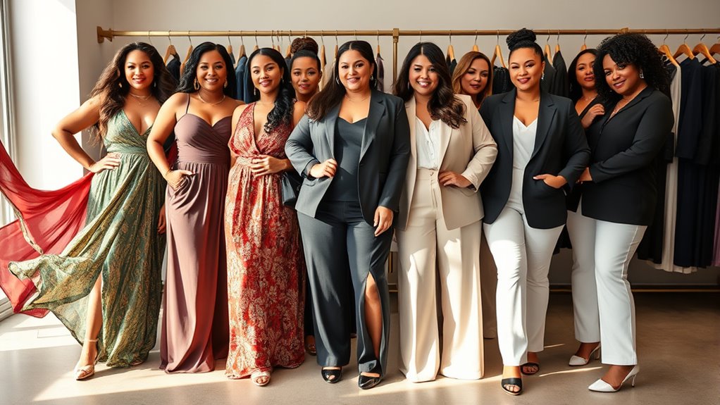 Selecting the right colors and patterns can substantially elevate a plus-size wardrobe by adding personality and versatility. Bright and vibrant hues, like warm browns and crisp whites, can lift your mood and create visual interest. Patterns such as floral, plaid, or abstract designs not only look fashionable but also help conceal problem areas, making you feel confident. Having a variety of patterns enables mix-and-match styling, giving you more outfit options. When choosing colors and patterns, consider what complements your skin tone and personal preferences—it can make a significant difference in how you feel in your clothes. By thoughtfully selecting bold hues and flattering patterns, you’ll craft a wardrobe that’s both expressive and adaptable, reflecting your unique style while ensuring comfort and confidence.
