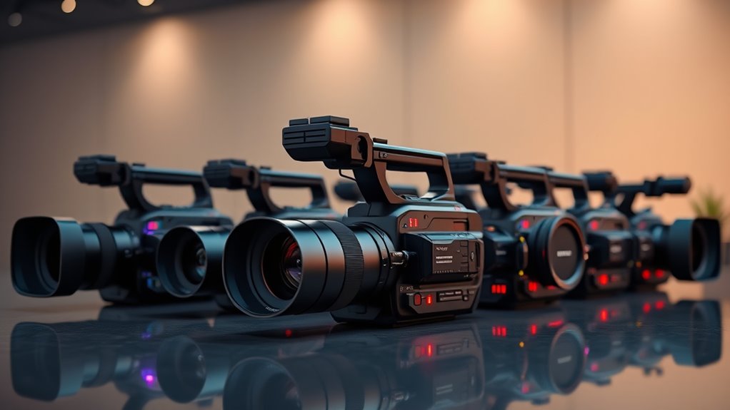 If you’re looking for the 15 best professional video camcorders of 2025 that deliver stunning cinematic quality, I’ve got you covered. These models support ultra high-res 8K, 6K, or 4K footage, with superb stabilization, incredible zoom capabilities, low-light, and night vision features. They also offer advanced connectivity options and long battery lives, perfect for professional production. Keep exploring to discover detailed insights that will help you choose the right camera for your creative needs.
