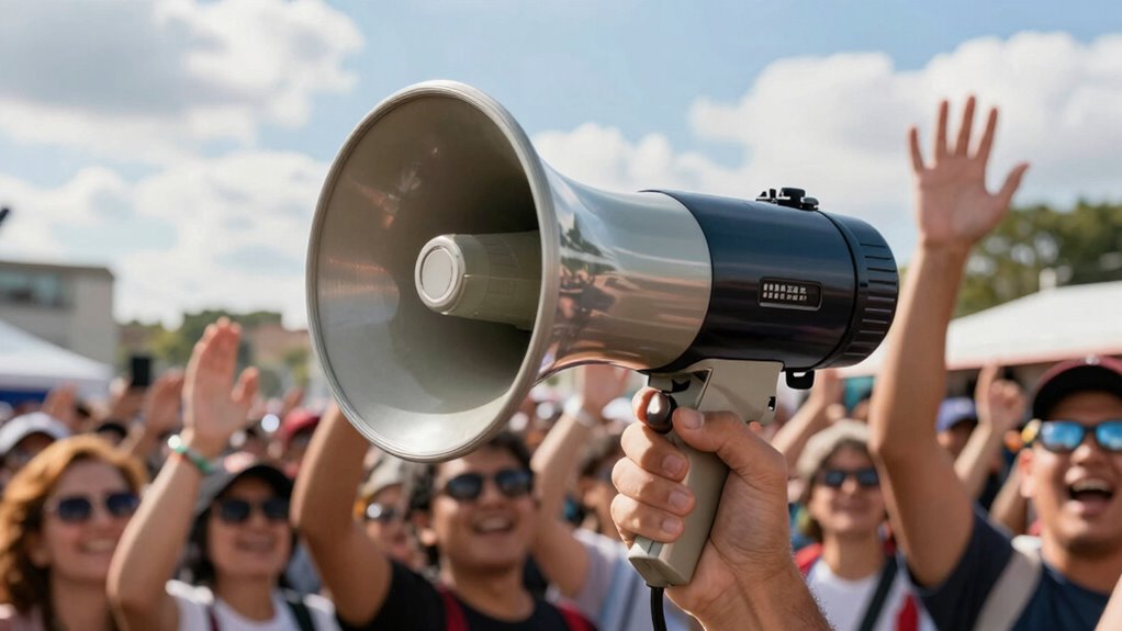 Did you know that in many places, noise ordinances limit sound levels to protect public peace? Yes, there are legal restrictions on using megaphones for crowd control. I always check local laws before using one, as excessive noise can lead to fines or legal issues. It is crucial to use megaphones responsibly, ensuring you’re compliant with regulations to avoid trouble while effectively managing crowds.