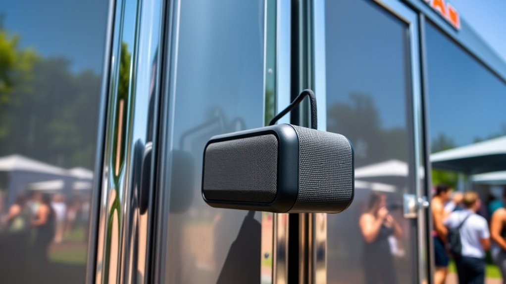 Sound clarity is just as important as waterproof durability when selecting a restroom trailer Bluetooth speaker. High-definition digital effects and well-balanced mid and high frequencies ensure the audio sounds crisp and natural. Powerful drivers, like 4-inch dynamic ones, markedly boost clarity and richness, making vocals and instruments stand out. Noise-canceling microphones and digital signal processing help cut through background noise, especially in busy or echo-prone environments. Proper enclosure design and placement also matter, as they reduce vibrations and sound distortion. Additionally, waterproof and marine-grade construction keeps sound quality consistent despite moisture, humidity, or splashes. When choosing a speaker, look for these features to guarantee clear, high-quality audio that enhances the overall experience, even in challenging restroom trailer environments.