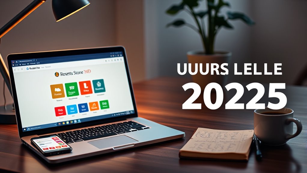 Have you considered how additional learning resources can boost your language skills with a Rosetta Stone lifetime subscription? These extras, like mobile apps, audio companions, and community forums, markedly enhance your learning experience. Supplementary materials such as live tutoring sessions and language games help reinforce your skills and keep you engaged. Access to native speaker practice and online conversation groups can boost your confidence in speaking beyond just the software. When choosing a deal, check if these resources are included or if they come at an extra cost, as this impacts the overall value. Make sure the subscription offers extensive tools like pronunciation feedback, cultural content, and progress tracking. These extras can make or break your learning journey, so evaluate their availability carefully.