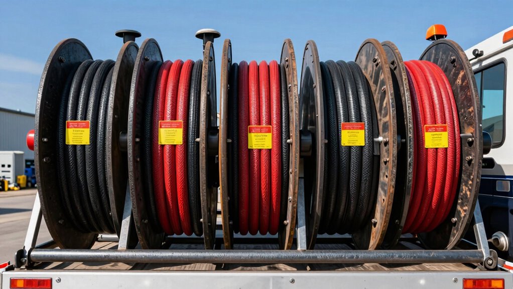 Selecting the right hose length and capacity is essential to guarantee your service truck can handle all wastewater removal tasks efficiently. First, determine the maximum hose length needed for your typical jobs to ensure adequate reach without overstretching. Consider the hose diameter and capacity so it can handle the volume of wastewater without losing flow or pressure, which is critical for efficient operation. Evaluate the reel’s capacity to support the total hose length and thickness while maintaining portability and stability during use. Also, check if the reel allows for future upgrades or additional attachments, giving you scalability as your needs grow. Finally, guarantee the reel design supports smooth retraction and deployment of the entire hose length without tangling or kinking, securing reliable performance over time.