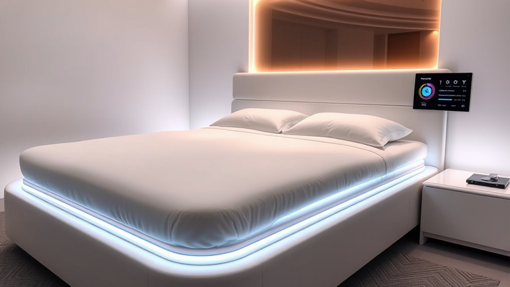 Smart beds customize sleep settings by using built-in sensors that monitor my movements, heart rate, and breathing patterns. They analyze this data to automatically adjust firmness, temperature, and support throughout the night. I can also personalize settings via a smartphone app, guaranteeing my bed adapts to my preferences and sleep cycles. This tailored approach helps me wake up refreshed and ensures I get the best sleep every night.