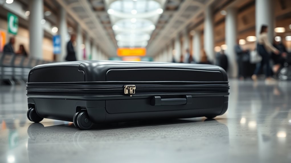 Durability and water resistance play a pivotal role in ensuring your smart luggage can withstand the rigors of travel. I look for luggage with at least an IP67 or IP68 waterproof rating, which guarantees protection against rain and brief immersion. Using tough materials like polycarbonate, ABS plastic, or impact-resistant alloys helps it endure rough handling and impacts during transit. Reinforced corners and sturdy zippers are essential to prevent damage from drops or pressure. I also verify that the GPS tracker inside is sealed or embedded securely to avoid water ingress and damage to electronic parts. Weather-resistant zippers, seals, and protective casings keep water out over time and in diverse conditions. Durability and water resistance are essential for reliable performance and longevity on my travels.